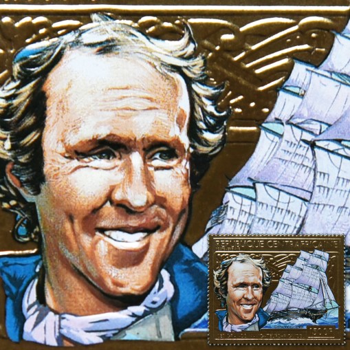 Złoty znaczek upamiętniający francuskiego żeglarza nazwiskiem Eugene Riguidel. W 1979 wygrał on transatlantyckie regaty na trasie Lorient-Les Bermudes-Lorient.