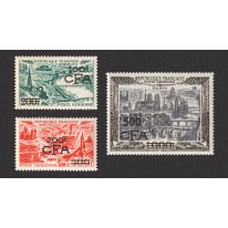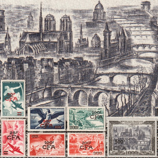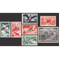 Są to poprzednio wydane francuskie znaczki poczty lotniczej z nadrukami CFA i przedrukami nominału.