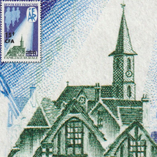 Jest to znaczek francuski, propagujący pomoc dla rodzin wiejskich, z nadrukiem CFA i przedrukiem nominału. Emisja przypadła na 25. rocznicę Funduszu Pomocy dla Rodzin Wiejskich (Aide Familiale Rurale).