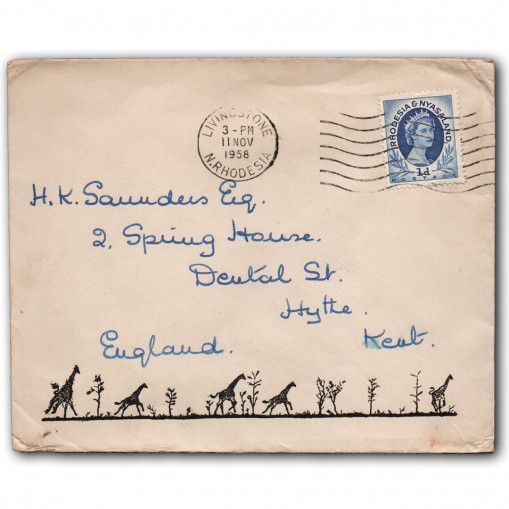 Koperta została zaadresowana z Livingstone w Rodezji Północnej do Hythe w brytyjskim hrabstwie Kent.