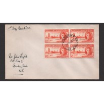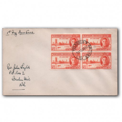 List ze znaczkami w czwórce wydanymi w 1946 roku dla upamiętnienia zakończenia drugiej wojny światowej. Na znaczkach widnieje król Jerzy VI oraz Pałac Westminsterski, siedziba brytyjskiego parlamentu.