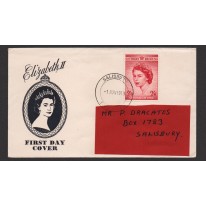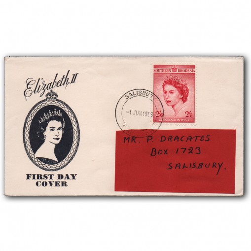 Znaczek na kopercie pierwszego dnia obiegu upamiętniający koronację Elżbiety II. Na znaczku widnieje portret monarchini.