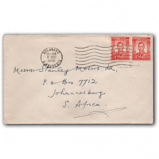 Koperta została zaadresowana z Bulawayo w Rodezji Południowej do Johannesburga w Republice Południowej Afryki.