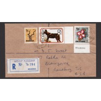 List poczty poleconej ze znaczkami wydanymi w latach 1974 i 1976, na których widnieją antylopa kudu wielkie, likaon pstry i kwiat adenium arabskiego (potocznie róża pustyni).