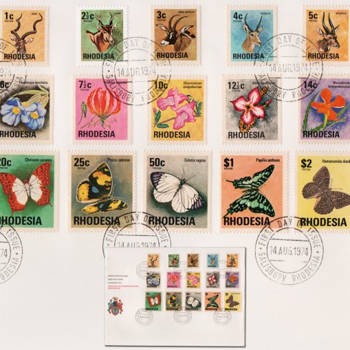 Na znaczkach widnieją występujące w byłej Rodezji gatunki antylop, kwiatów i motyli, kolejno: