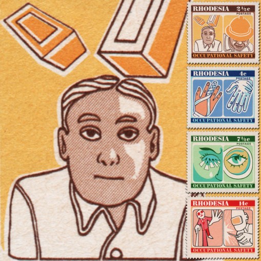 Seria promująca bezpieczeństwo w miejscu pracy i stosowanie ochronnych hełmów, rękawic, okularów i masek.