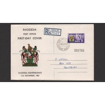 Znaczek na ilustrowanej kopercie pierwszego dnia obiegu wydany z okazji uzyskania przez Rodezję niepodległości.