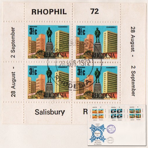 Znaczki w blokach na ilustrowanej kopercie pierwszego dnia obiegu upamiętniające wystawę filatelistyczną RHOPHIL’72. Walory te wydano pierwotnie jako część serii obiegowej dwa lata wcześniej. Okolicznościowe bloki mają na marginesach daty i miejsce wystawy RHOPHIL. Na znaczkach widnieją kolejno: