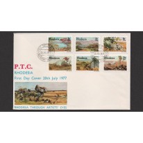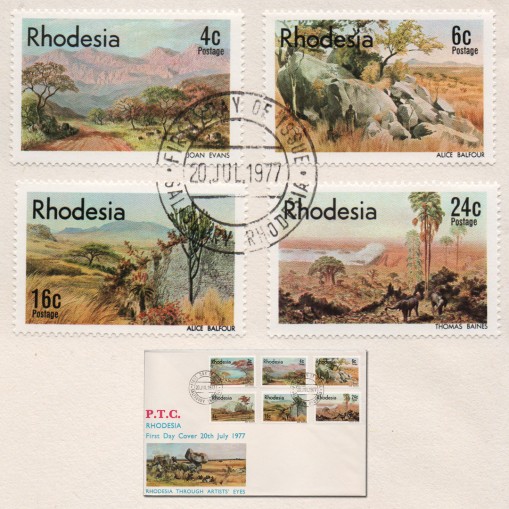 Na znaczkach widnieje rodezyjskie malarstwo pejzażowe, kolejno: