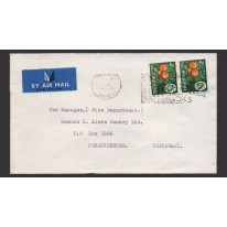 List poczty lotniczej z znaczkami obiegowymi wydanymi w 1966 roku, na których widnieją owoce pomarańczy.