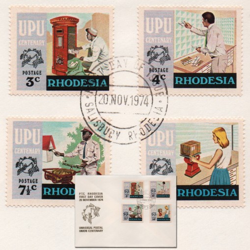 Seria na kopercie pierwszego dnia obiegu upamiętniająca stulecie Światowego Związku Pocztowego.