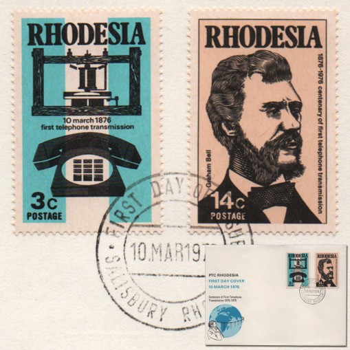 Seria na kopercie pierwszego dnia obiegu upamiętniająca setną rocznicę wynalezienia telefonu przez Alexandra Grahama Bella.