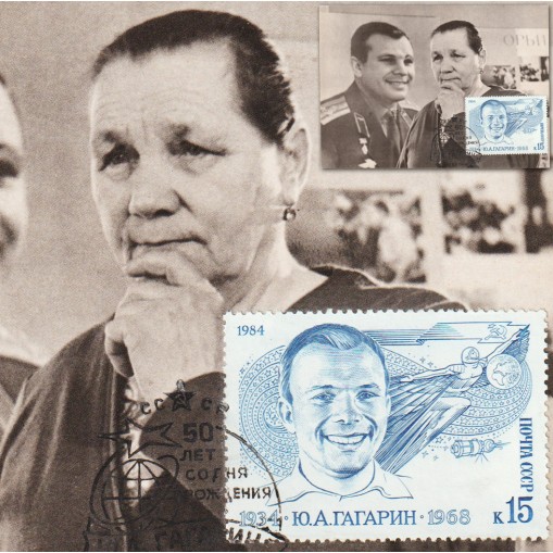 Na karcie przedstawiono matkę Gagarina stojącą przed portretem syna.