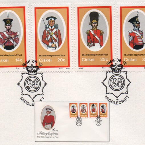 Seria na ilustrowanej kopercie pierwszego dnia obiegu, na znaczkach której widnieją mundury brytyjskiej formacji wojskowej - 98. pułku piechoty.