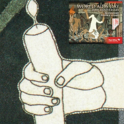 Samoprzylepne znaczki w zeszyciku filatelistycznym upamiętniające 25. rocznicę obchodów Światowego Dnia Walki z AIDS.