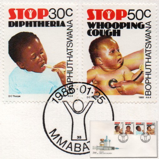 Seria na kopercie pierwszego dnia obiegu promująca walkę z polio, odrą, błonicą i krztuścem wśród dzieci.