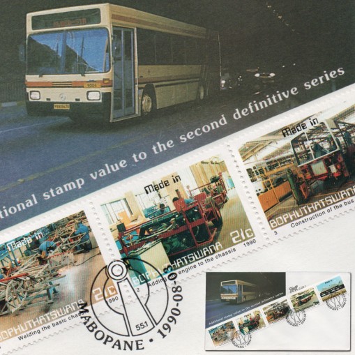 Seria na kopercie pierwszego dnia obiegu, na znaczkach której przedstawiono przykład przemysłu w byłym bantustanie Bophuthatswany - fabryka autobusów.