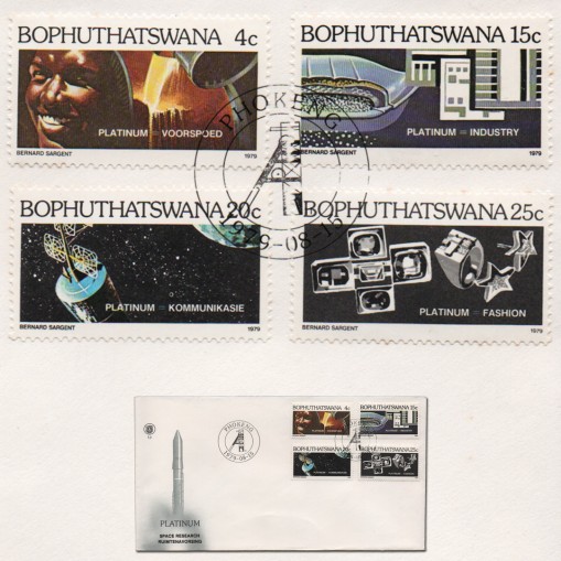 Kasowana grzecznościowo seria na ilustrowanej kopercie pierwszego dnia obiegu ukazująca przemysł wydobycia platyny w byłym bantustanie Bophuthatswany.