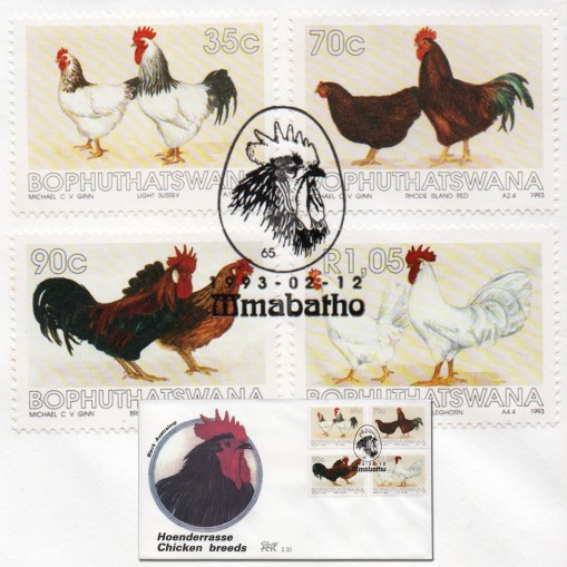 Seria na kopercie pierwszego dnia obiegu, na znaczkach której widnieją następujące odmiany kur hodowane na terenie byłego bantustanu Bophuthatswany: