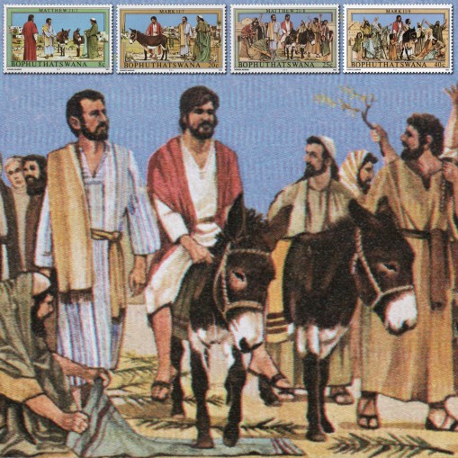 Na znaczkach widnieją sceny biblijne oraz numer wersetu z Ewangelii według św. Mateusza lub św. Marka, który dana scena przedstawia.