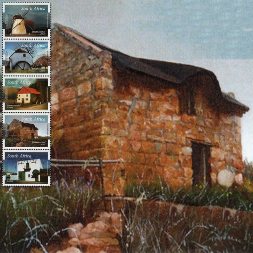 Na znaczkach widnieją budynki tradycyjnych młynów w Południowej Afryce, kolejno: