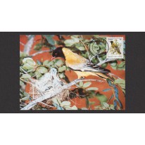 Na znaczku i karcie widnieje wilga czarnogłowa (Oriolus larvatus).