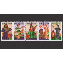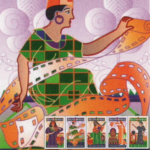 Na znaczkach widnieją: aktorka z maską, kobieta z rolką filmu fotograficznego, kobieta grająca na gitarze, tancerka i malarka.