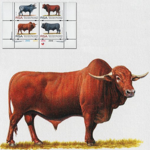 Na znaczkach widnieją południowoafrykańskie rasy bydła, kolejno: Nguni, Bonsmara, Afrikander i Drakensberger.