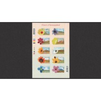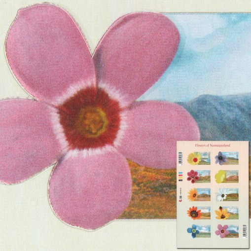 Samoprzylepne znaczki w arkuszu, na których widnieją następujące gatunki kwiatów pustynnych z południowoafrykańskiego regionu geograficznego Namaqualand: