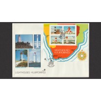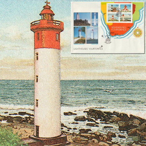 Kasowana grzecznościowo seria w bloku na ilustrowanej kopercie pierwszego dnia obiegu prezentująca następujące latarnie morskie zlokalizowane w Namibii i RPA: