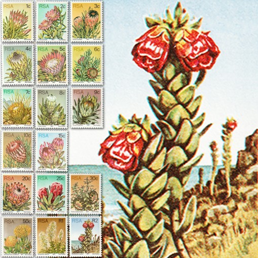 Na znaczkach przedstawiono przeróżne gatunki roślin z rodziny srebrnikowatych (Proteaceae) licznie występujące w Afryce Południowej. Protea królewska to kwiat narodowy RPA stanowiący jeden z elementów godła tego kraju. Jest ona tak powszechna w kwiaciarniach południowoafrykańskich jak w Polsce róża, tulipan czy goździk.