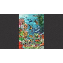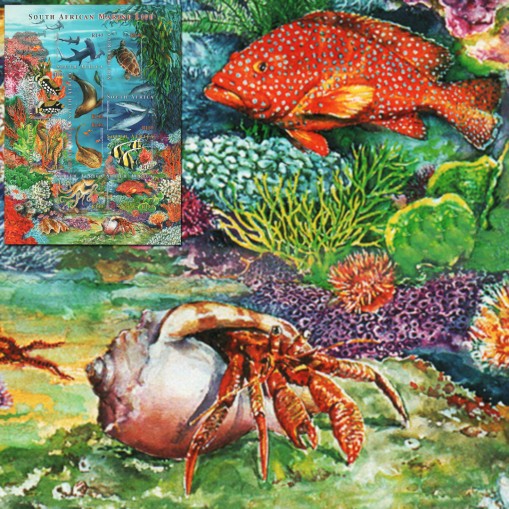 Samoprzylepne znaczki w arkuszu prezentujące faunę zamieszkującą wody u wybrzeży Afryki Południowej.