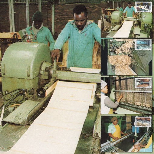 Seria na kartach maksimum przedstawiająca etapy produkcji zapałek, kolejno: