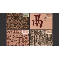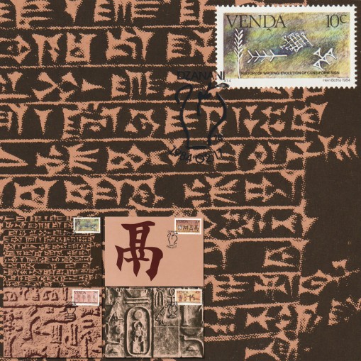 Seria znaczków na kartach maksimum, na których przedstawiono ewolucję pisma od obrazkowego do coraz bardziej symbolicznego, co następowało poprzez usuwanie detali z kolejnych wersji pisma, aż do osiągnięcia prostych znaków, kolejno: