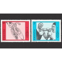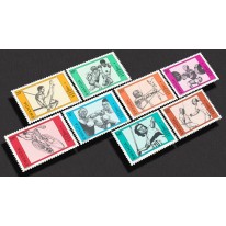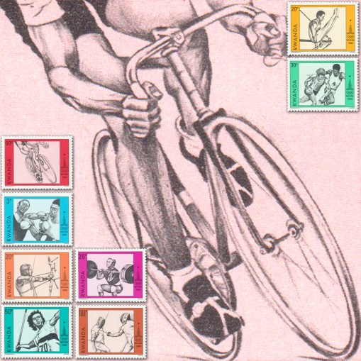 Na znaczkach przedstawiono kilka dyscyplin olimpijskich, kolejno gimnastykę, koszykówkę, kolarstwo, boks, łucznictwo, podnoszenie ciężarów, rzut oszczepem i szermierkę.