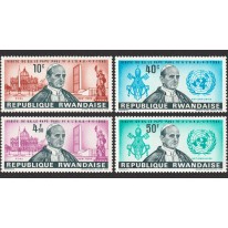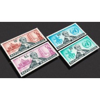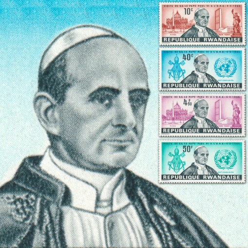 Znaczki upamiętniające wizytę papieża Pawła VI w siedzibie ONZ w Nowym Jorku. Na znaczku widnieje ojciec święty, widoki Rzymu i Nowego Jorku oraz symbol ONZ i herb papieski.