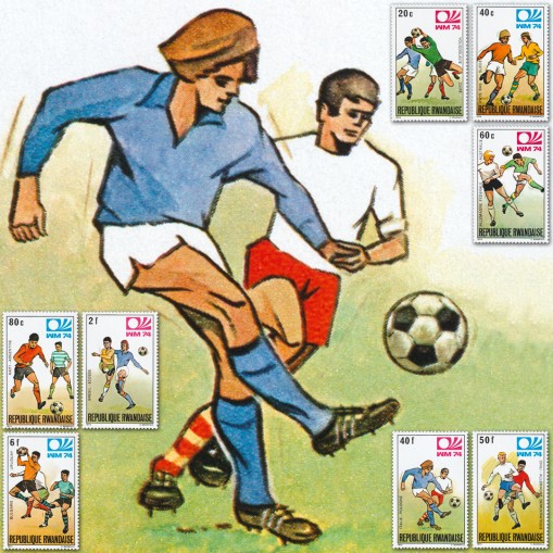 Rwanda nie brała udziału w tym Mundialu (z drużyn afrykańskich zakwalifikowały się tylko Algieria i Kamerun), ale wydano ten oto zestaw, przedstawiający zawodników różnych narodowości w akcjach piłkarskich.