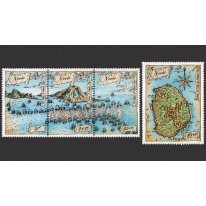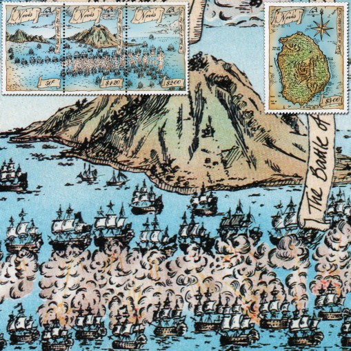 Na znaczkach w pasku widnieje bitwa w Zatoce Frigate w 1782 roku, na ostatnim znaczku zaś przedstawiono francuską mapę wyspy Nevis z 1764 roku.