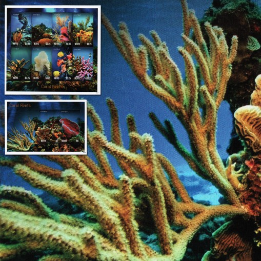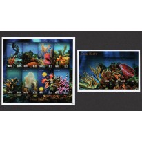 Seria w arkuszu i blok, na znaczkach których widnieją różne gatunki koralowców.