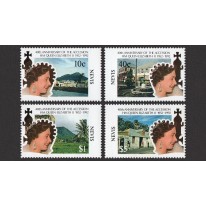 Na znaczkach widnieją portrety monarchini obok widoków z Nevis.