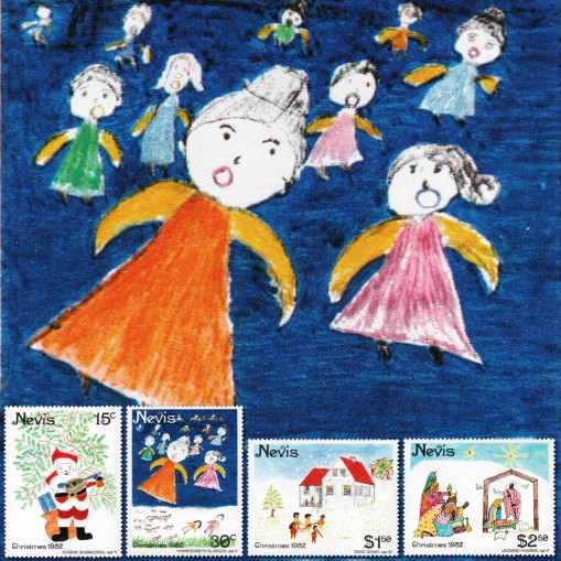 Na znaczkach widnieją rysunki dzieci przedstawiające świętego Mikołaja, kolędników, udekorowany dom i muzyków oraz pokłon pasterzy.