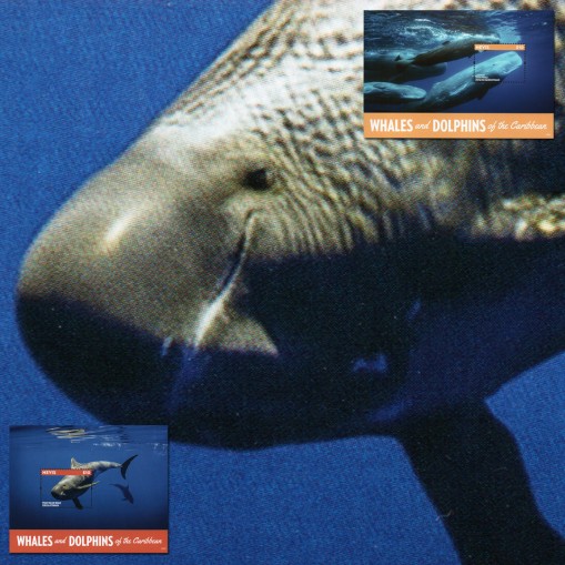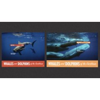 Dwa bloki, na znaczkach których widnieją następujące gatunki waleni: