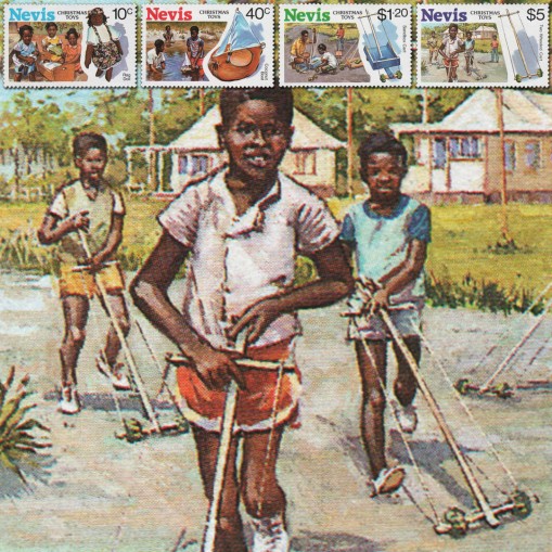 Na znaczkach widnieją zabawki: lalka, łódka z łupiny kokosa i wózki.
