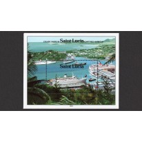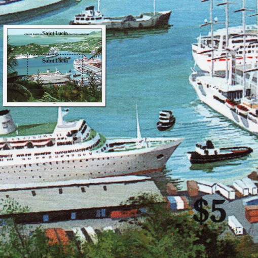 Znaczek w bloku, na którym widnieją wycieczkowce w porcie Castries.