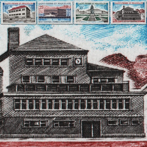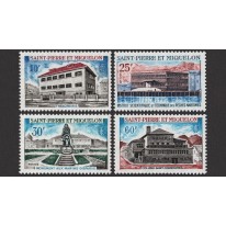 Na znaczkach widnieją budynki publiczne i pomnik na Saint Pierre i Miquelon, kolejno: