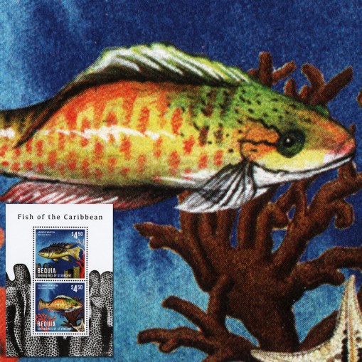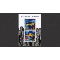 Blok, na znaczkach którego widnieją następujące gatunki ryb: