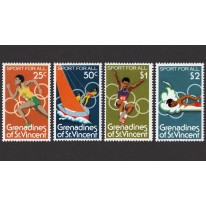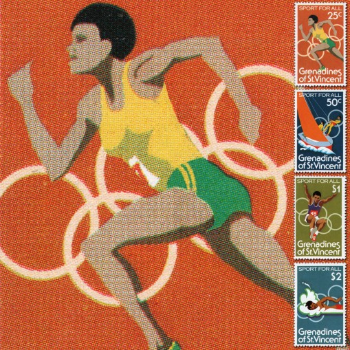 Na znaczkach widnieją pierścienie olimpijskie oraz bieg, żeglarstwo, skok w dal i pływanie.