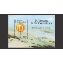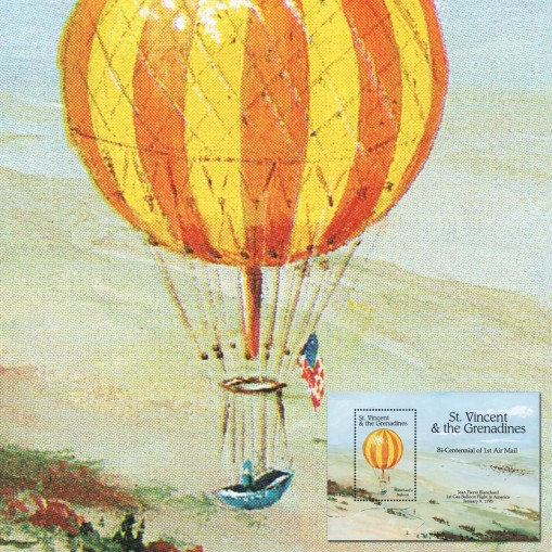 Znaczek w bloku upamiętniający 200. rocznicę pierwszego amerykańskiego lotu balonem dokonanego przez Francuza Jeana-Pierre’a Blancharda.