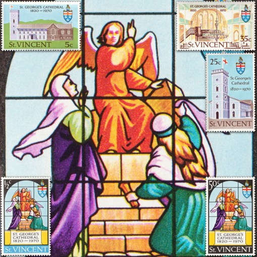 Znaczki upamiętniające 150. rocznicę zbudowania katedry Świętego Jerzego w Kingstown, stolicy Saint Vincent.