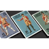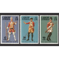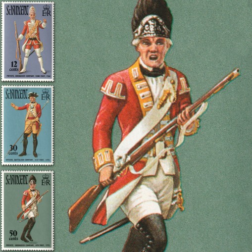Na znaczkach widnieją mundury oficera i szeregowców brytyjskiej armii z XVIII wieku.